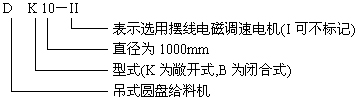 標記示例 表1 圓盤給料機技術參數表 型號 | 敞開吊式 | DK6 | DK8 | DK10 | DK13 | DK16 | 封閉吊式 | DB6 | DB8 | DB10 | DB13 | DB16 | 圓盤直徑 | 600 | 800 | 1000 | 1300 | 1000 | 圓盤轉速 | 8 | 8 | 7.5 | 6.5 | 6 | 吊筒至盤面高度 | 50~130 | 60~165 | 80~220 | 110~275 | 120~340 | 最大物料粒度 | 25 | 30 | 40 | 50 | 60 | 最大生產能力 m3/h | 物料自然溜角 | 25o | 1.82 | 3.57 | 7.79 | 13 | 22.7 | 30o | 2.25 | 4.42 | 9.64 | 16.1 | 28.1 | 35o | 2.73 | 5.35 | 11.7 | 19.5 | 34.1 | 40o | 3.27 | 6.42 | 14.0 | 23.4 | 40.8 | 45o | 3.9 | 7.65 | 16.7 | 27.9 | 48.8 | 最小生產能力 m3/h | 物料自然溜角 | 25o | 1.63 | 2.83 | 6.18 | 10.3 | 16.9 | 30o | 1.28 | 2.2 | 4.8 | 8.0 | 13.1 | 35o | 1.02 | 1.77 | 3.85 | 6.4 | 10.3 | 40o | 0.83 | 1.44 | 3.14 | 5.21 | 8.55 | 45o | 0.69 | 1.18 | 2.59 | 4.29 | 7.03 | 電機功率 kw | 1.1 | 1.1 | 1.5 | 3 | 4 | 配套螺旋閘門 mm | 250×250 | 300×300 | 400×400 | 500×500 | 600×600 |